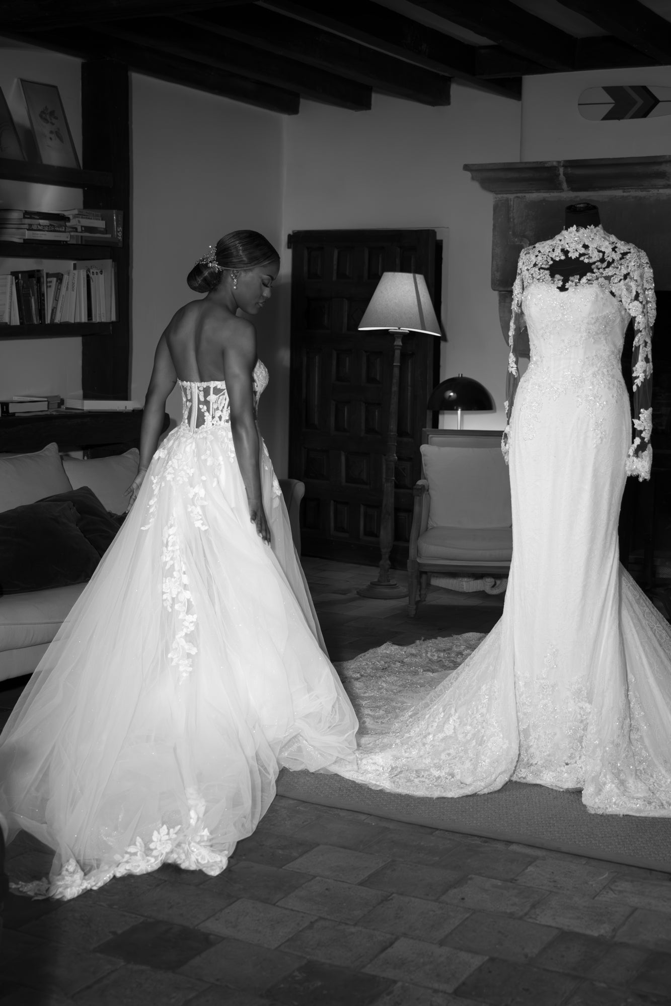 Les manches bouffantes amovibles permettent de moduler l’allure selon le moment : plus spectaculaire pour les photos, plus épurée une fois retirées.