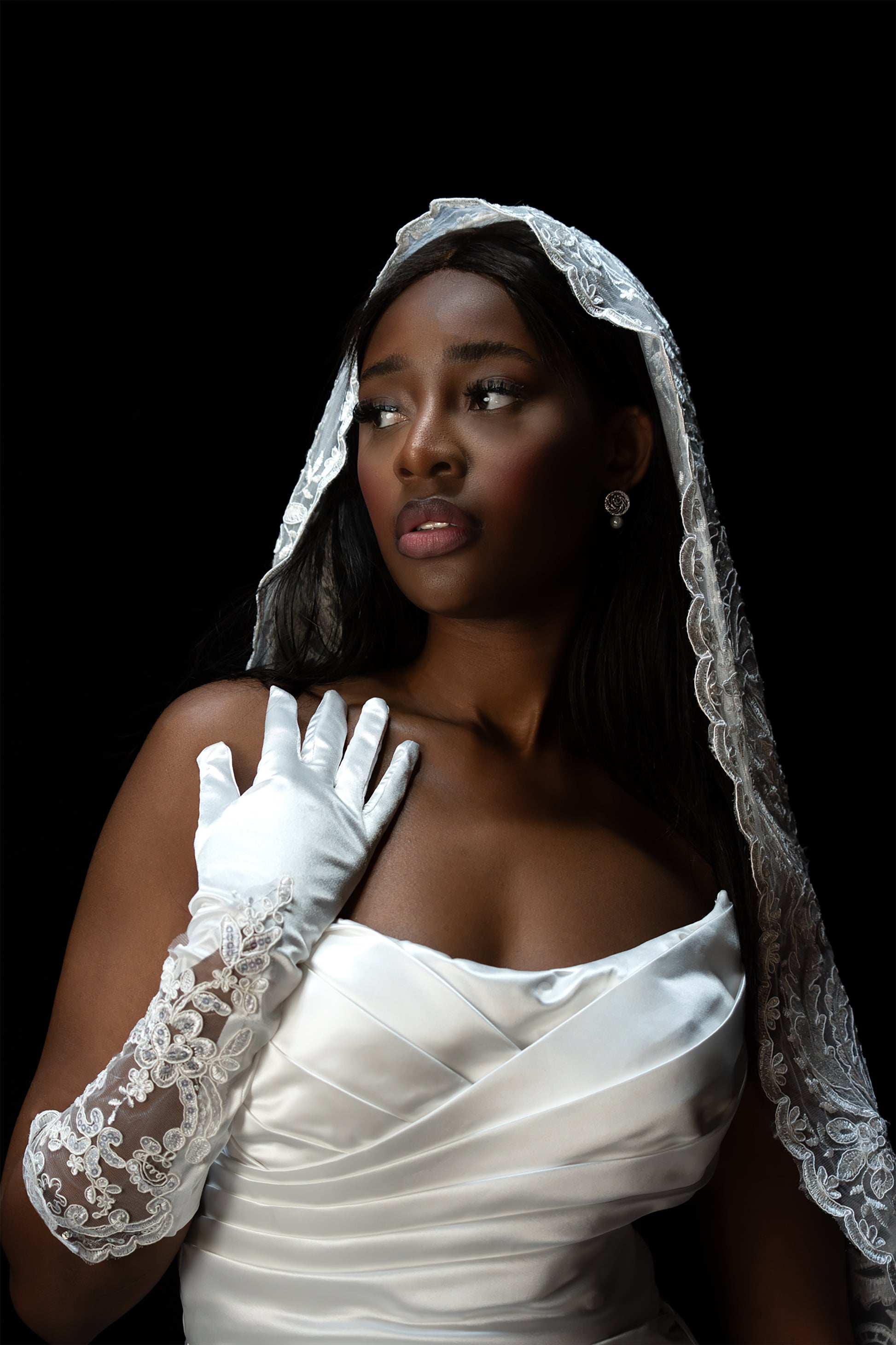 Le look est complété par un voile cathédral, dont le contour est entièrement orné de dentelle délicate, ainsi que par une paire de gants en satin et dentelle, signature d’un glamour intemporel et sophistiqué.